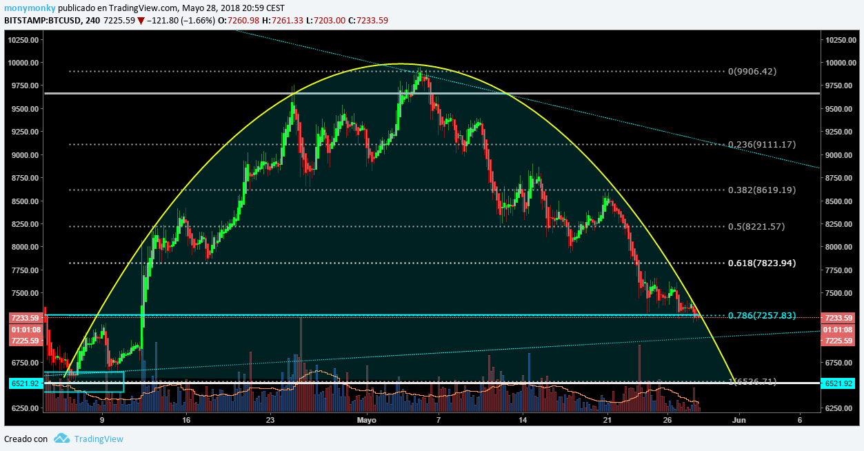 Bitcoin lleva desde el día 7 de abril metido en una cápsula (techo redondeado) de la cual no le ha sido posible salir y ha ido rompiendo todos los soportes fibo. Actualmente se encuentra en el nivel 0.786 sobre los $7250 donde se ha mantenido en los últimos dias.