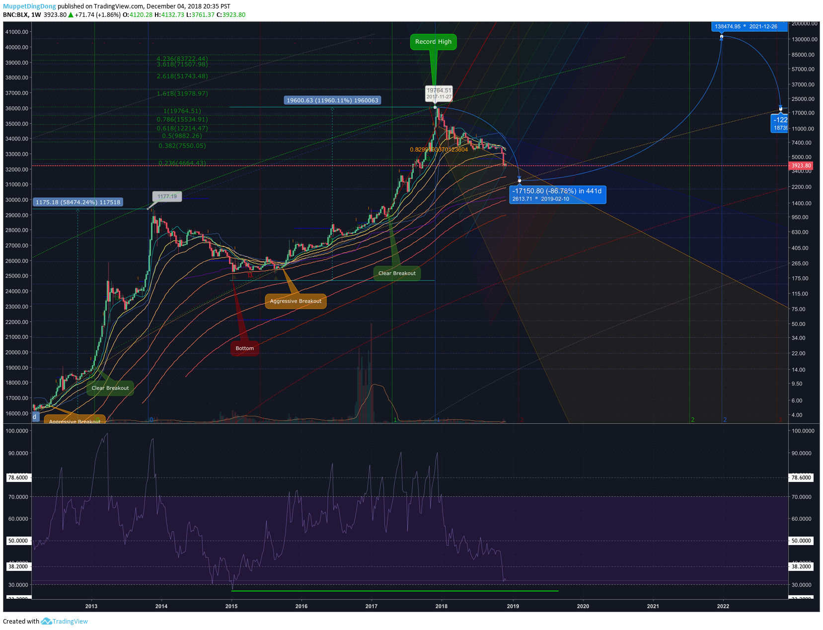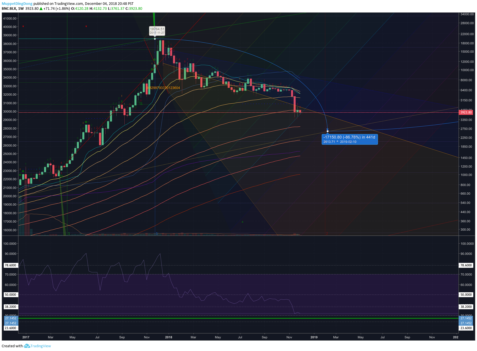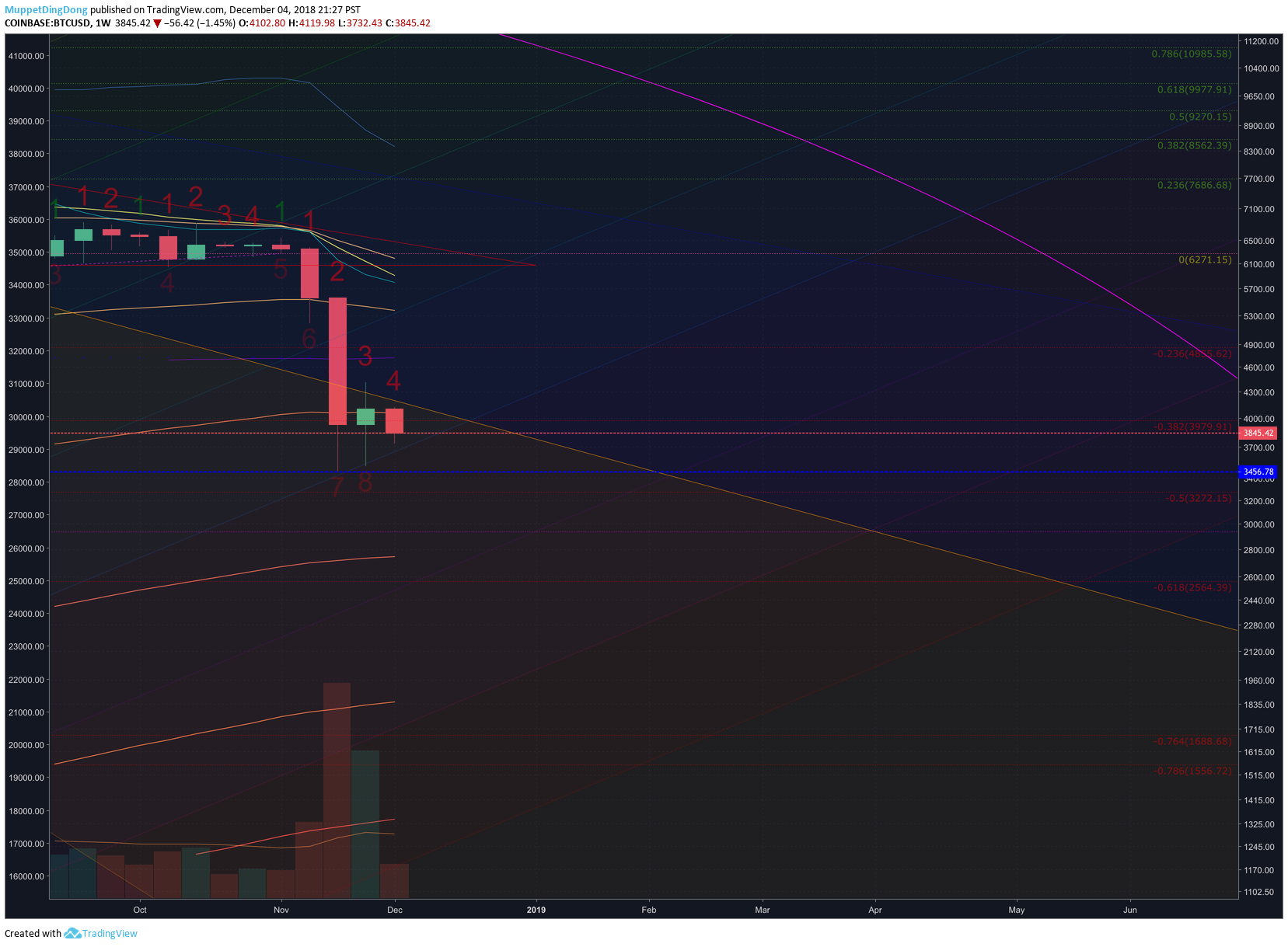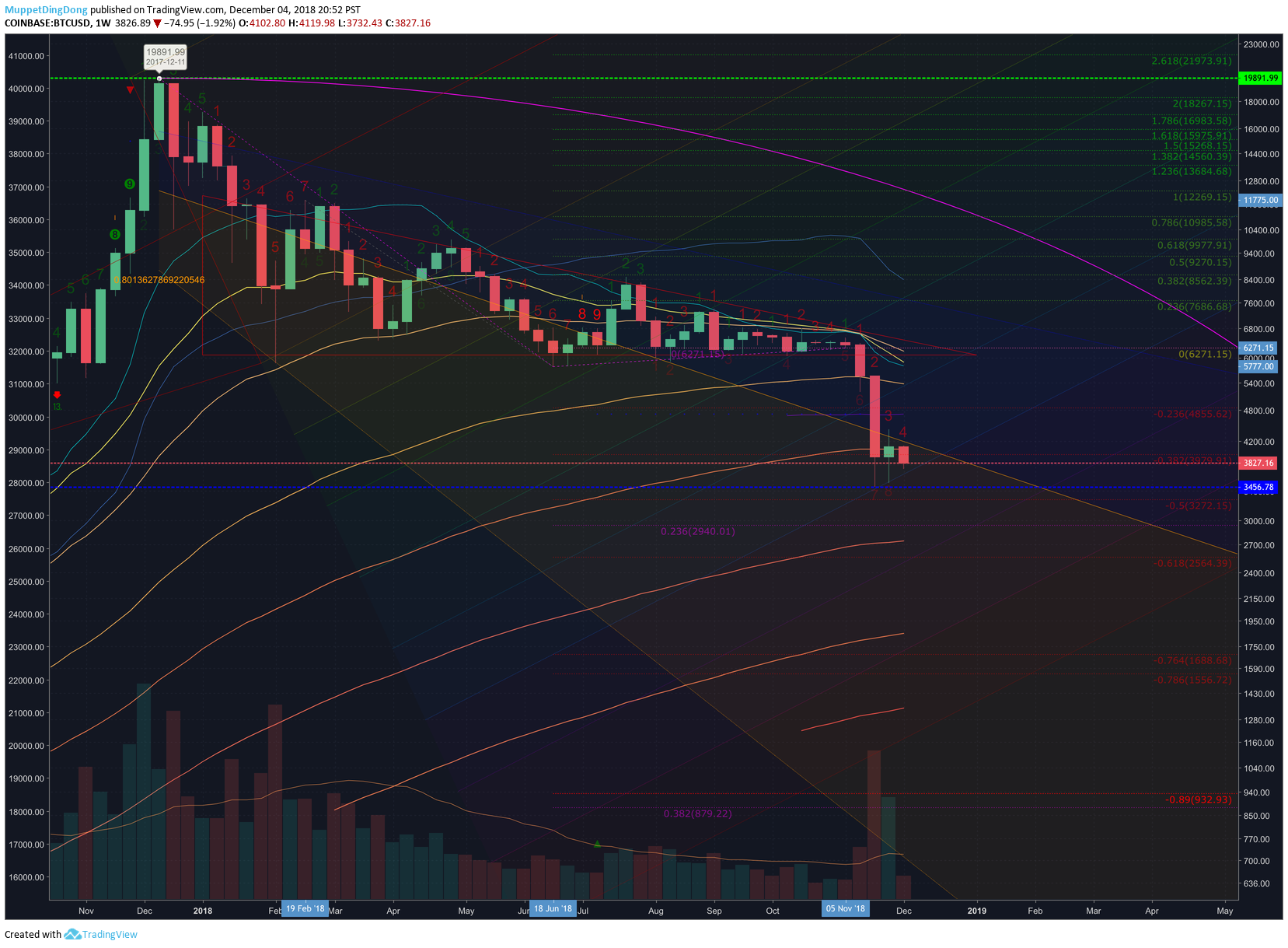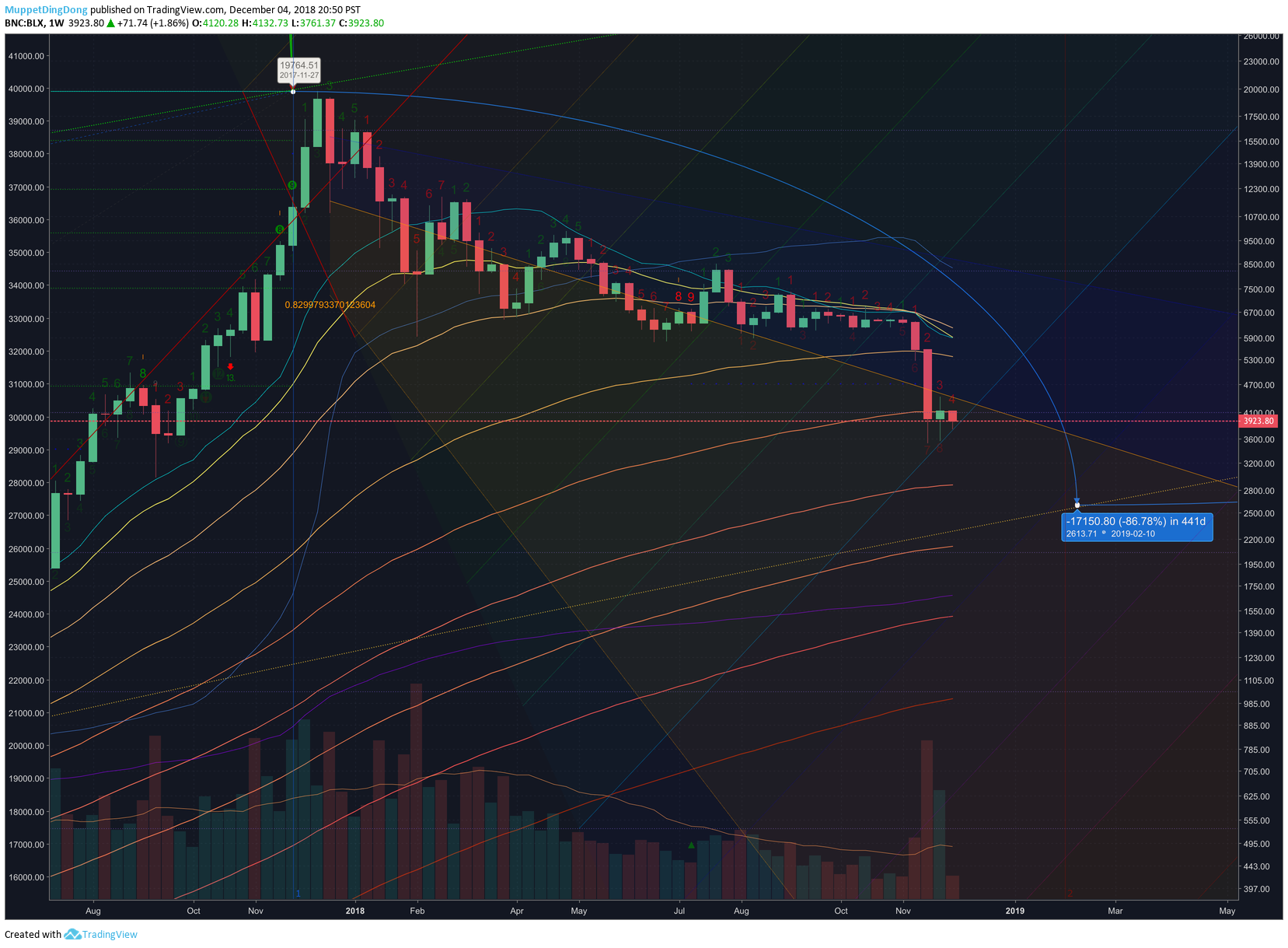 If this analysis is correct, another 5ish more weeks of bitcoin price winter in this bear market. Then a re-evaluation phase, assuming we stay above about 2500 on a weekly closing basis. Negative case on this would be fuck all these fib lines, moving averages and TA, going below 2000 will cause chaos among the community where hodlers of last resort will rethink their positions holding bags? You decide.