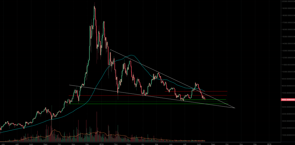 A new downtrend is emerging, the way seems open to the famous support to 5000 USD. Buyers must stay above the last annual bottom at 5780 USD to avoid a fall to 5000 USD.