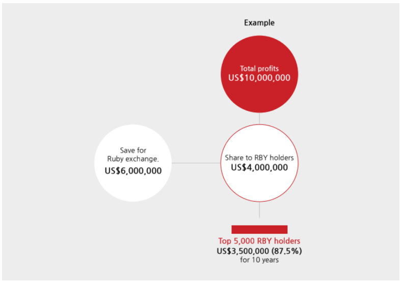 - The best 5000 RBY holders will be shared the benefits of Ruby-x: this implies in the best holders will get 40% of benefits or 10% of income, each quarter if every year