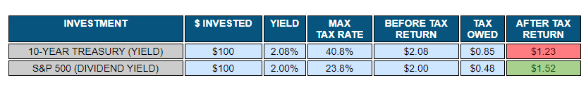 You see, the dividend yield on the S&P 500 is right around 2%, while the yield on the benchmark 10-year Treasury is 2.4%. But each is taxed differently.