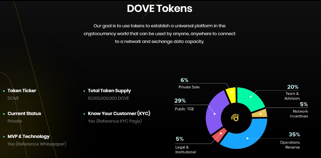 A total of 10 billion tokens will be minted for use on the Dove platform, this token will be ERC20 Compatible tokens generated from the Ethereum ecosystem. The Dove team as chose the Ethereum ecosystem due to its ability to scale, smart contract features and its open distributed ledger technology.