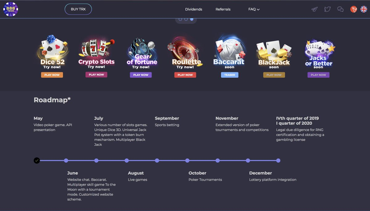 The last thing I want to speak about - plans of the project. At the moment, there are no a lot of games in the casino but all of them are enjoyable (not copies or licensed games that were taken from other casinos), I see they are genuine and created by the team but what I really like that very soon 888tron.com will become a universal platform for any gambler, because the team has plans to open Poker, skill game "To the moon" (with tournament mode) and Sport betting that is really cool and could give additional fun.