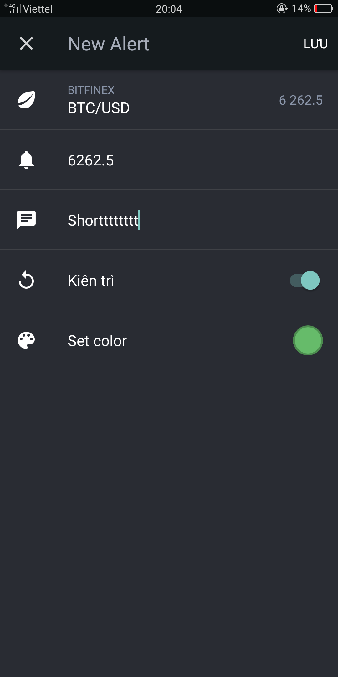 This is an indispensable feature of a mobile app. To add a noticeable price, you click the bell on the far right and add the required information, press the button repeatedly when the price reaches that level if needed. I usually add a few notes on that price, for example, when the price touches x then Long, the price hit y, stop loss stick. I also choose the color for notification, for example stop loss for the red, take profit stick for the blue. This color of the trade makes me very much inspired.