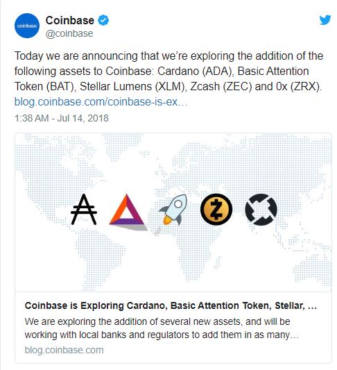 This Week wasn't that good and favorable for all the Altcoins except Cardano, Stellar, Zcash, 0x and BAT. These coins are added to Coinbase as per it's official tweet.