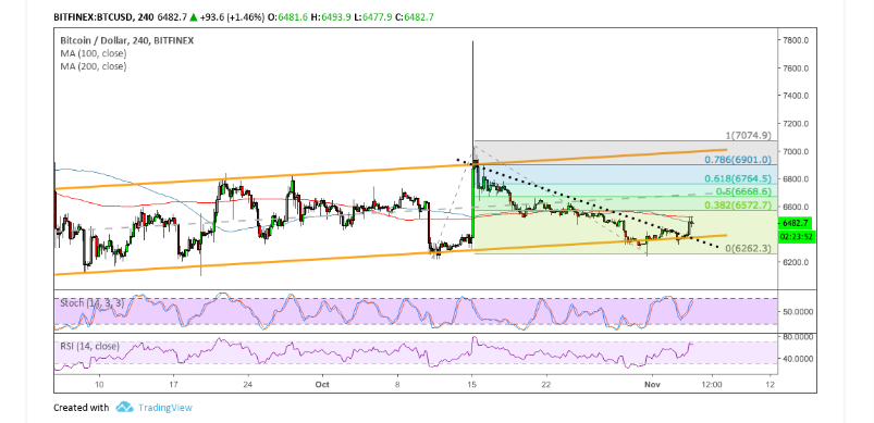 Applying the Fibonacci extension tool shows that the 38.2% extension is just close by and may also provide extra resistance. The mid-channel area of interest that lines up with the 50% level and might also attract selling pressure. Sustained bullish momentum could take bitcoin to the 78.6% extension at the channel top or the full extension around $7,075.