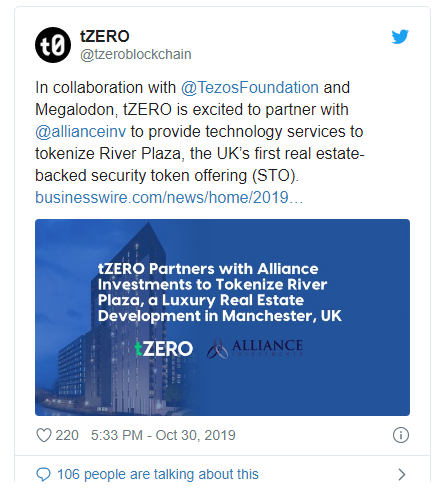 Just yesterday, the Tezos Foundation and tZERO, Overstock's security token platform, announced that it would be worth almost $ 650 million in real estate in the Tezos blockchain. The properties are funded by Alliance Investments, based in the United Kingdom. The first property to be tokenized is under construction in Manchester, England, and will be available in the first quarter of 2020.