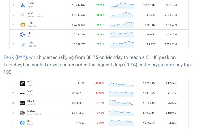 Cardano (ADA) also came through for its holders, and grew by 7%. Both XLM and ADA were mentioned by Coinbase as cryptocurrencies they are exploring as possible additions to their platform, and we know from past experience that many traders like jumping on Coinbase-related speculation.
