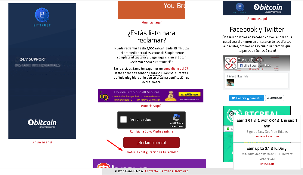 Para el primer paso lo que tiene que hacer ir hacia la pagina de bonusbitcoin se meten a su cuenta y van hacia abajo a donde dice reclama ahora, si veran bien abajo les saldra una opcion que dice cambiar la configuracion de tu reclamo, les daran hay y les saldra unas opciones les marcaran en la segunda opcion que dice: Siempre reciba el monto promedio de reclamo. Ya a lo que le den hay hacen el procedimiento que ya yo les dije normal, podran reclamar mas de los que les iban a dar