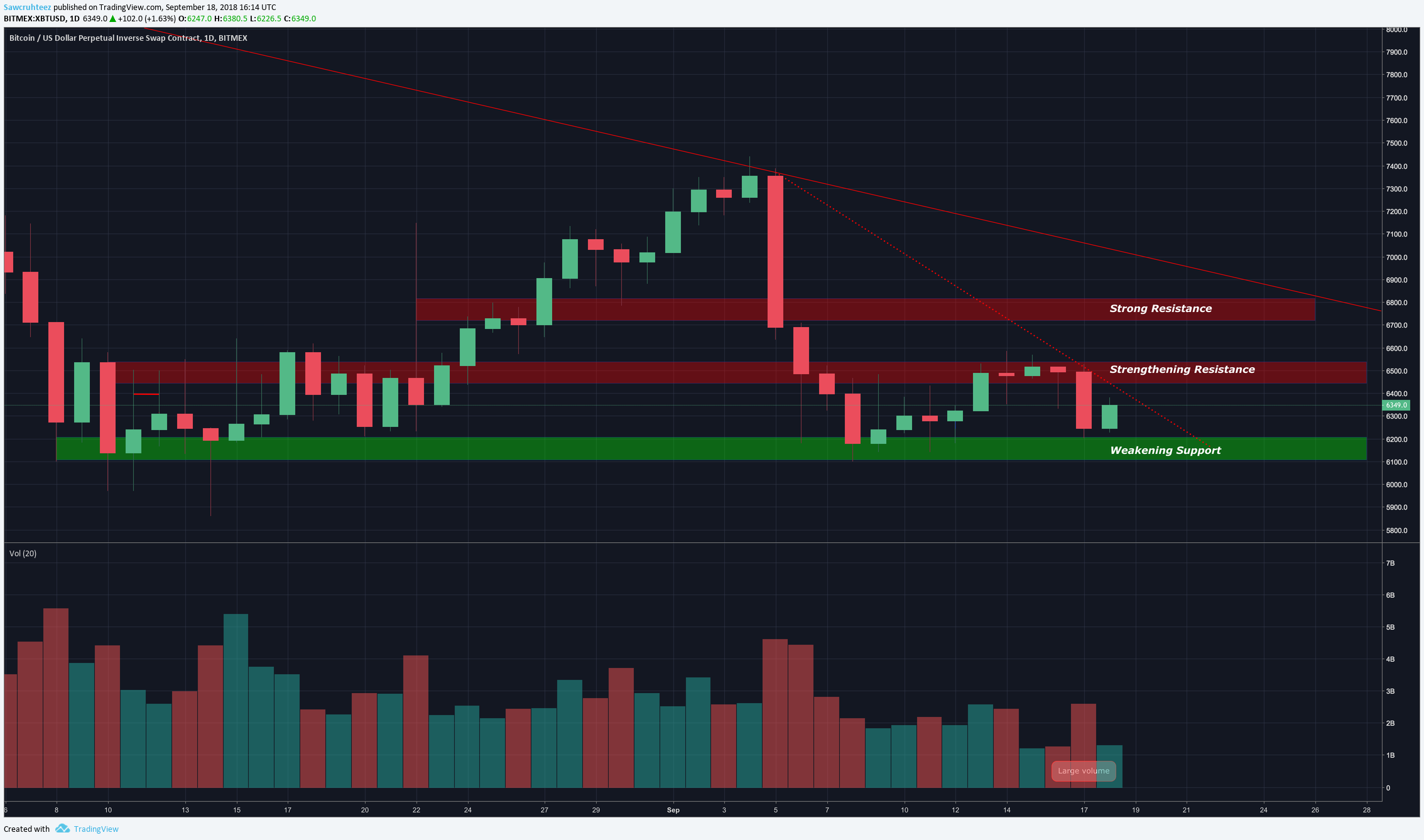 Summary: This bounce should provide a good opportunity to build a short, if you are not already in one. There is major resistance from $6,375 - $6,667 that is coming from: Visible Range Volume Profile point of control with 1m - 1y lookback, daily Tenken-Sen, Bollinger Band MA, 50 day MA as well as an up fractal.