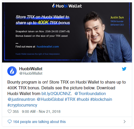 To incentivize adoption, Huobi recently organized a bounty program in which users got to share 400K TRX for storing their Tron in the Huobi Wallet.