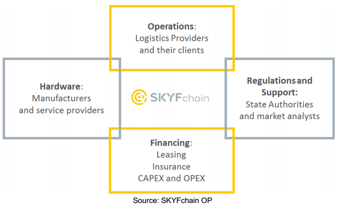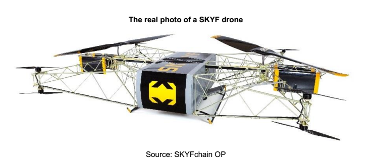 The SKYFchainOperatingPlatform willprovide a disruptive solution forswitchingglobal logistics industriesto unmanned systems.As an independent blockchain-based Operating Platform open to all industry participantsit will contain critical information for each stage of lifecycle of a cargo robot. Theoperations and access to clientsof SKYF dronewill be used todevelop and testthe SKYFchain. We aimto setthe standards for thenew industry inroboticdeliveryinareas such asfinancing, manufacturing, operations, maintenance,insurance, and authorizationof drones and robots in the air, on the ground and at the sea