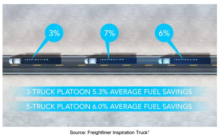 Proponents of automatedtrucks are talking about several useful features. They say that such trucks willbe more efficient because they wouldnot waste fuel by accelerating and braking as frequentlyas trucks driven manually by a human driver.Similarly,developers have plans to use truck platooning to save on fuel. Other benefits may include:increased safety and less stress for drivers during long-haul monotonous drives.
