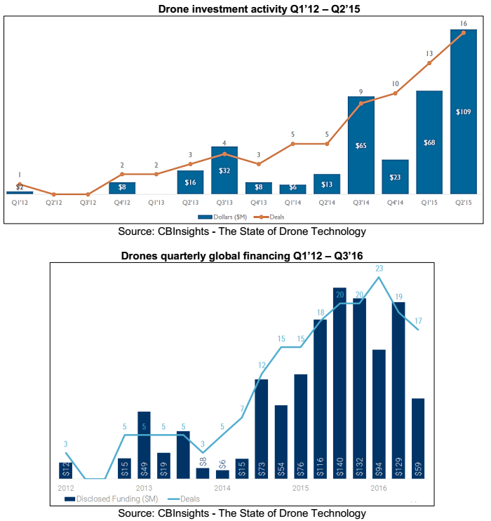 VC dealsAccording to the CBInsights report "The State of Drone Technology"1VC funds have recognized an opportunity in UC;the total disclosed VCcapital raised for unmanned systems (drones) in the year 2016 increased by 123% to over $1,3bn.