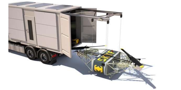 The SKYF Unmanned Aerial Carrier wasdesigned and built at ARDN Technology Limited (UK), whoseR&D HQ is now located in Kazan, Russia. Areas of the system'sapplications include: crop spraying and long distance delivery of goods. The SKYF device is a vertical take-off and landing device drone with two 2.8 m main rotors that synchronously rotate towards each other. The main rotors, which generate lift to ensure the drone isair-borne, are driven by a gasoline engine. The engine transmits torque through the gearbox and the belt drive to the main rotors.