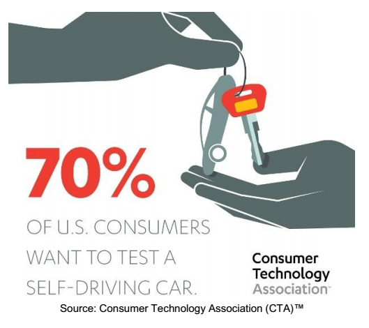 Passenger car drivers are ready to test automated carsAccording tothe press release of a Consumer Technology Association (CTA),™ mostdrivers (93 percent) use existing driver-assist features such as adaptive cruise control, parking assist, and collision avoidance. They thenappreciate the usefulness of these driving technology innovations.