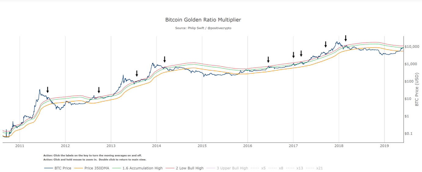 A more comprehensive indicator to use when assessing Bitcoin’s maco market structure and price action is Philip Swift’s Golden Ratio Multiplier. The tool tracks Bitcoin’s long-term price action along the 350 daily moving average, then multiplies the 350 DMA by the golden ratio (1.68) and numbers in the Fibonacci sequence (1,2,3,5,8,13,21).