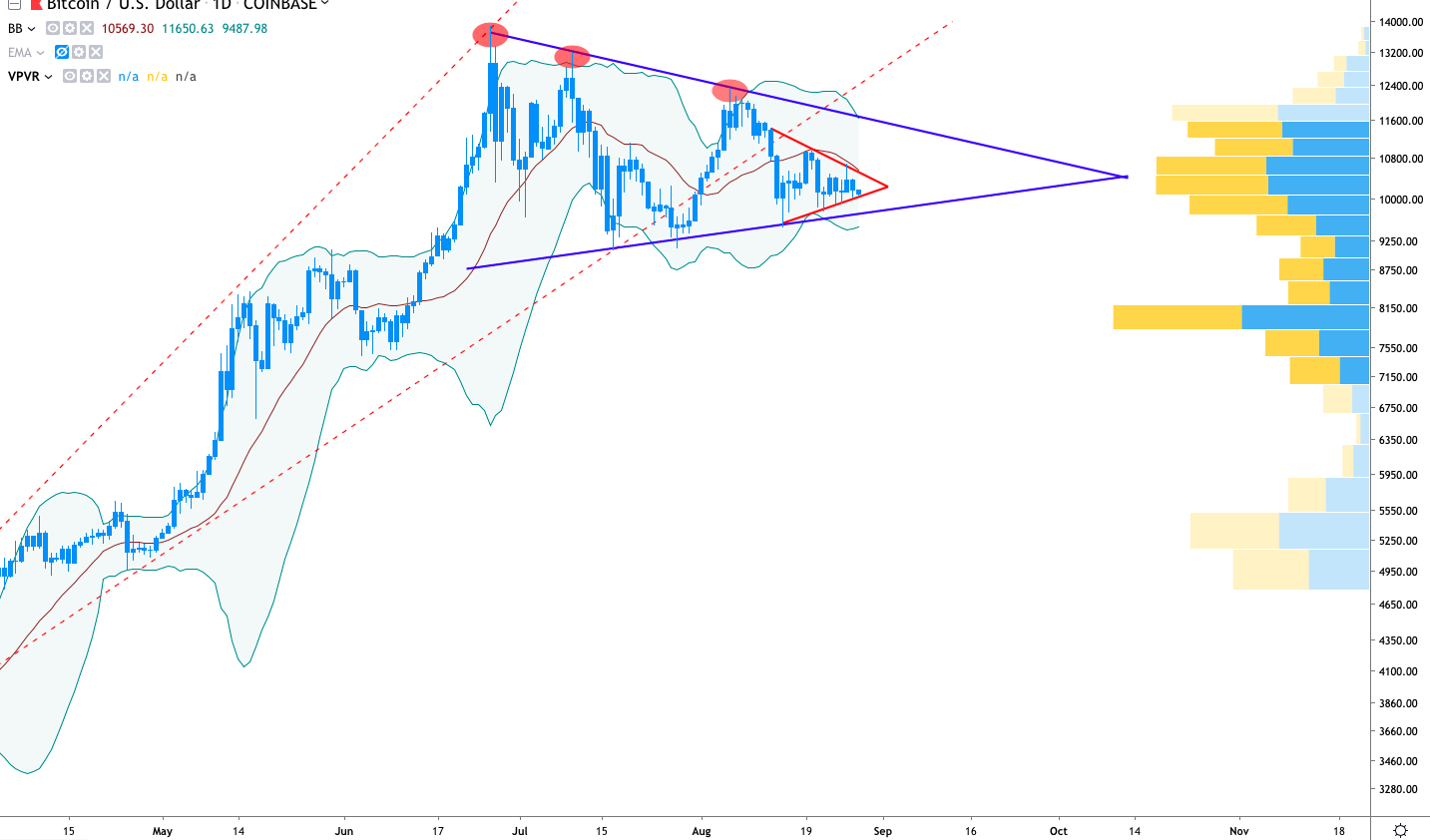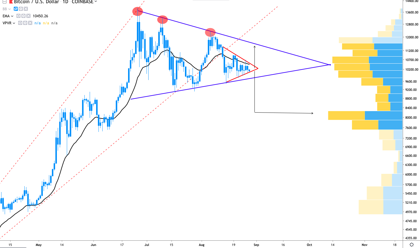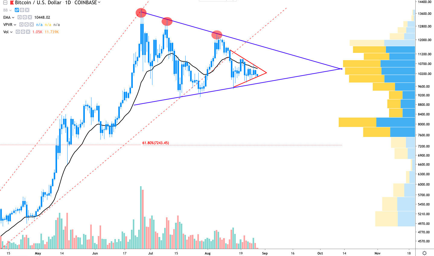 Taking a quick glance at Bitcoin’s daily chart, 4-hr and 1-hr chart and one will see a procession of bull pennants (symmetrical triangles) and ascending wedges in all variety of sizes. At the moment Bitcoin trades within a massive pennant extending from the June 26, 2019-high at $13,800 until the current price near $10,000.