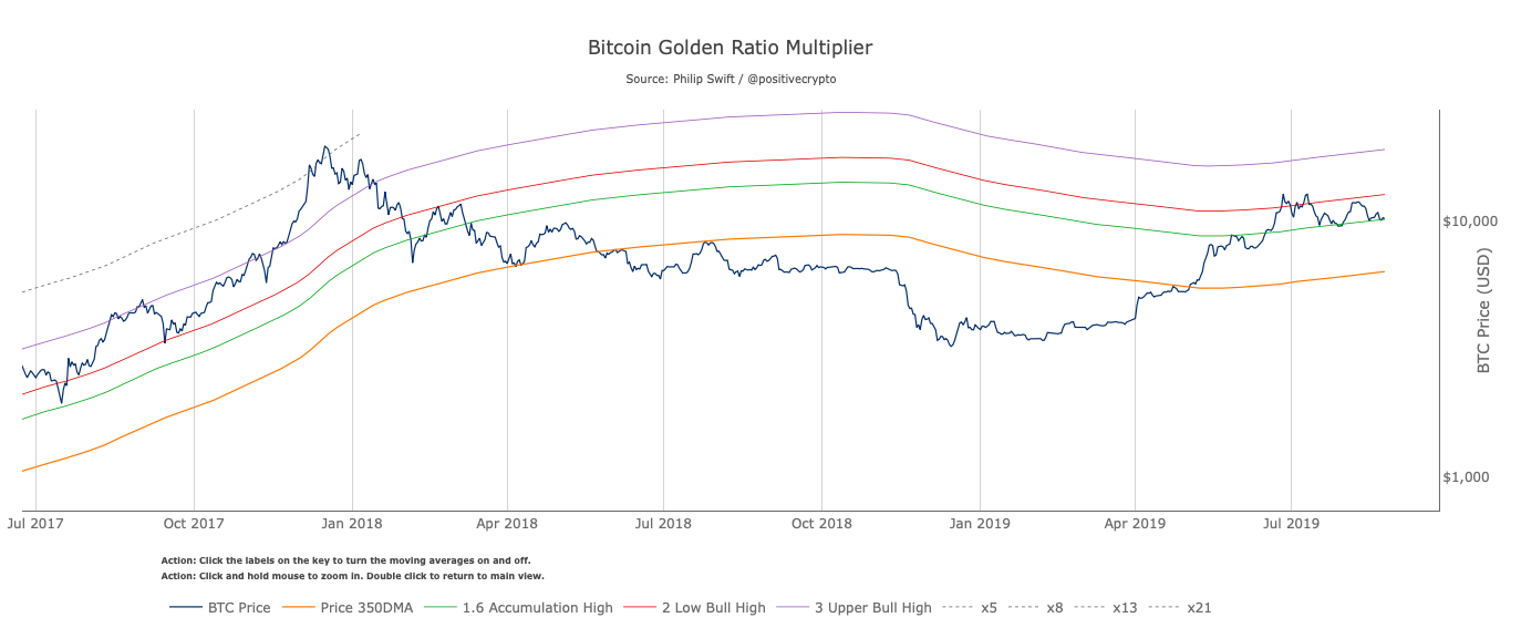 Currently, Bitcoin is pinned beneath the green (350DMA x 1.6) and red (350DMA x 2) averages with red representing a “low bull” phase and green standing for “accumulation.” Given that BTC is trading near $10,200 and riding along the green line at the time of writing, the indicator suggests that Bitcoin is still in an accumulation phase.