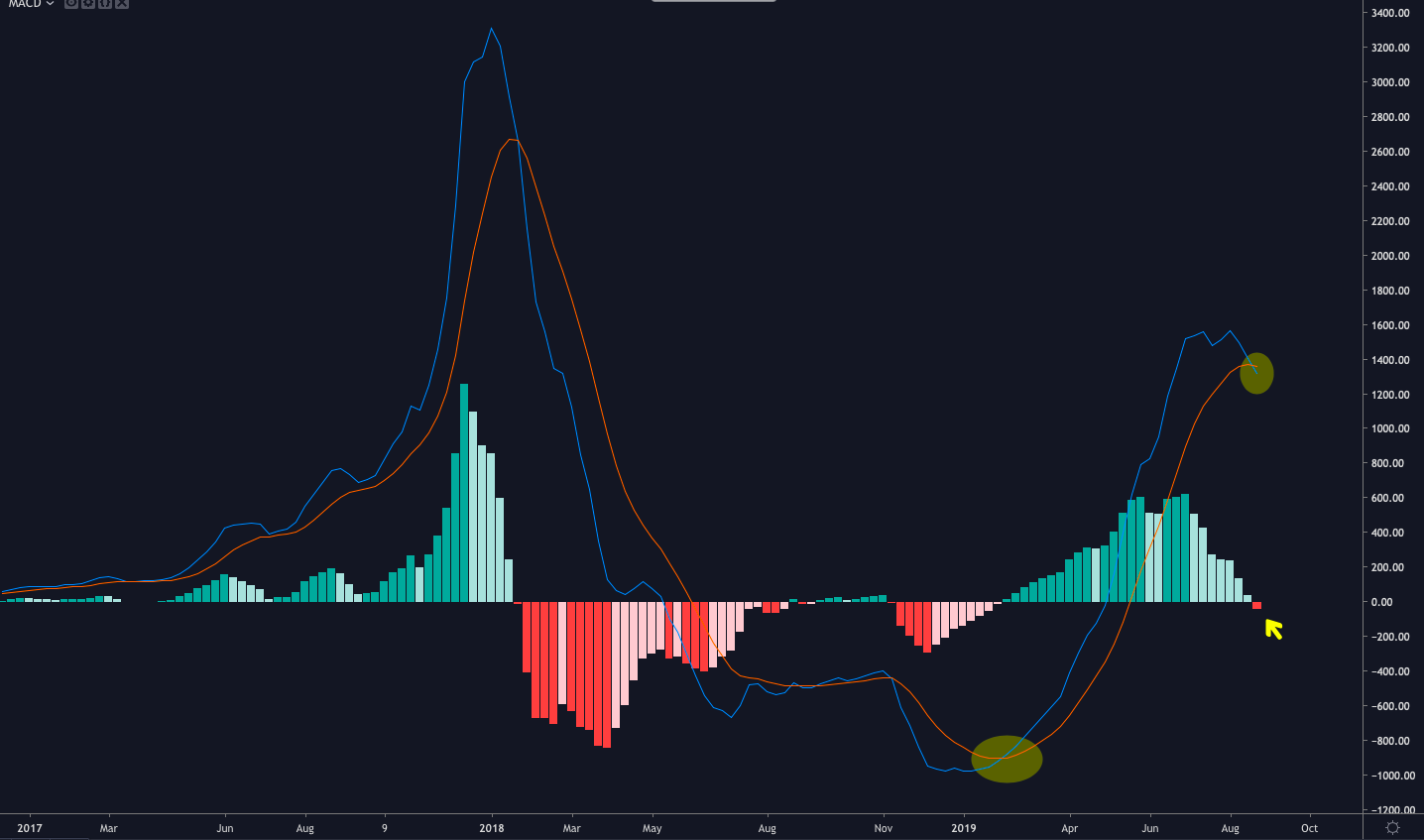 On the weekly time frame, one can see that the Moving Average Confluence Divergence (MACD) indicator plotted a > bearish crossover for the first time since the bottom was reached in February 2018 and the MACD crossed bullish.The MACD (blue) crossed below the signal line (red) over the weekend and dipped below 0 (baseline). One can also see that the histogram has turned negative and dipped into what could be interpreted as bearish territory. It should be noted that the MACD is a lagging indicator that does not accurately reflect an asset’s current price action.