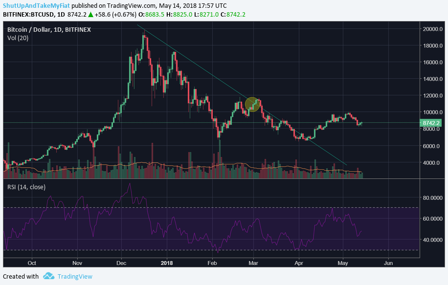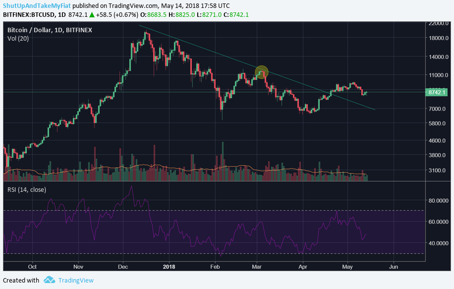 This is Bitcoin daily chart in linear scale and you can see at the yellow circle a clear breakout of the down trend line. But as you can see it didn't last long and the downtrend continues causing massive lose to traders who bought the breakout and thought that the down trend is over.
