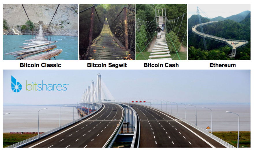 You see, unnoticed by any other busy bridge builders, BitShares has constructed a real-time industrial grade financial superhighway capable of handling all the world’s traffic. It’s been up for three years and already crunches as many transactions per second as VISA and all the leading digital currencies combined. And it will scale to millions when it upgrades to EOS next spring. All we have to do is make sure everyone knows how to use it by then.