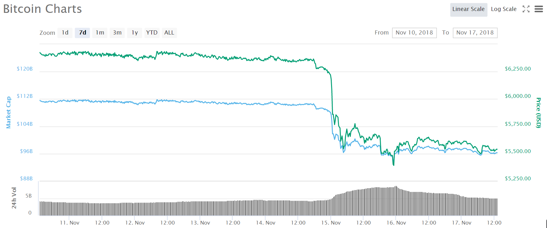 As reported by Bloomberg, Bitcoin's price at $5500 marks a one-year low from the lowest point of $6200 back in Feb 2018 right after the highest peak at Dec 2017.