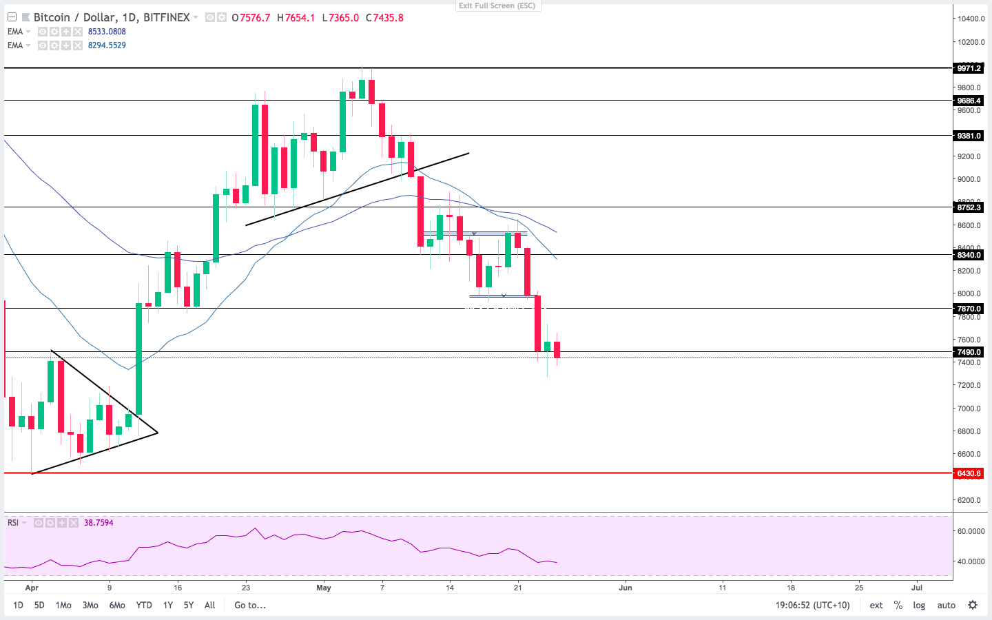 Great post! I believe we will continue to see this downwards move as price continues to close below major support levels. Over the previous 24hrs, price was unable to find support at the $7,500 region, suggesting we will be seeing another bearish move towards $6,500.