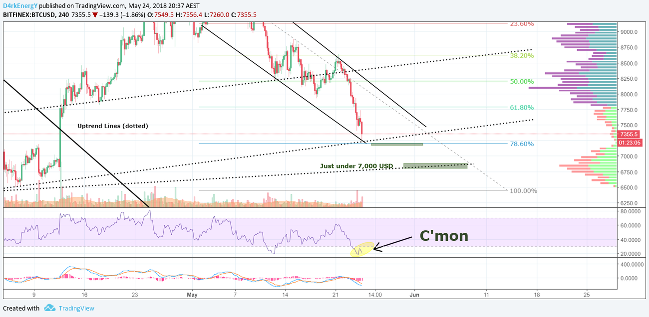 But that was also what I predicted :( We are around 7,340 now where we have weak support from my tunnel as you can see and the uptrend line - the next support is 7,200 USD, which is equal to 78,6 % Fibonacci Retracement - as I said earlier it is probably not enough, and as I see it right now, we have to go below 7,000 USD now.