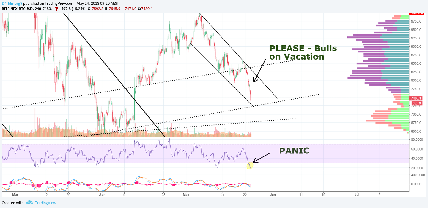 First of all: What we have witnessed today has surprised most of us. Not the fact that we dropped to 7,500 USD - but the way we did it. We just fell hard. Not even a decent up wave. RSI on 4h was 18, which is the lowest we have had in a year. It means completely oversold - People panicked!