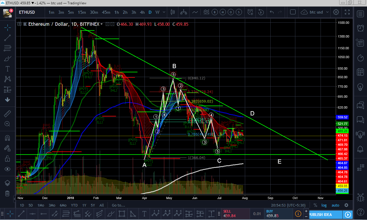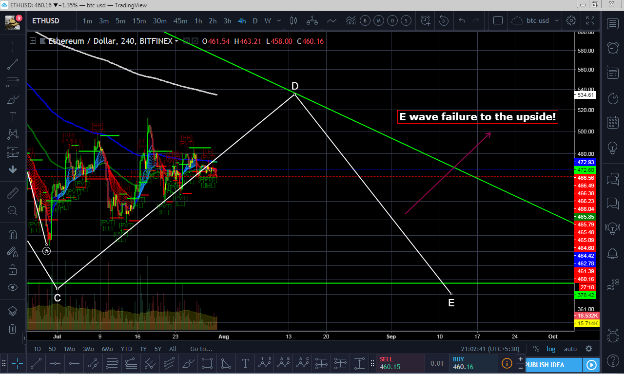 I don't have much to say about ethereum. The chart just looks scary, we are in a massive descending triangle and I only say that I hope we get an E wave failure to the upside and not complete our E wave and crash down to lower price range