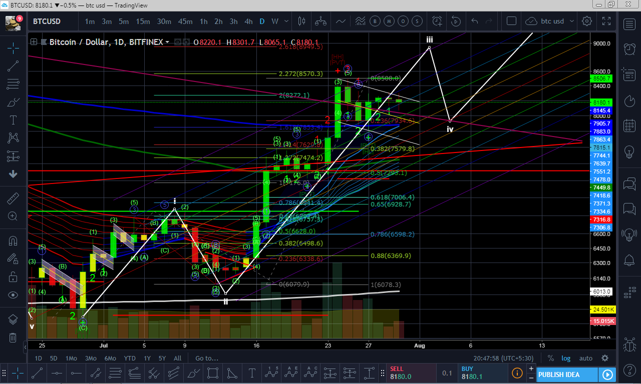 In this count I think that we have already finished our 3rd wave on the larger degree and are starting out with the fourth wave which might take us down to T1 - $7,500 and T2 - $7,200.