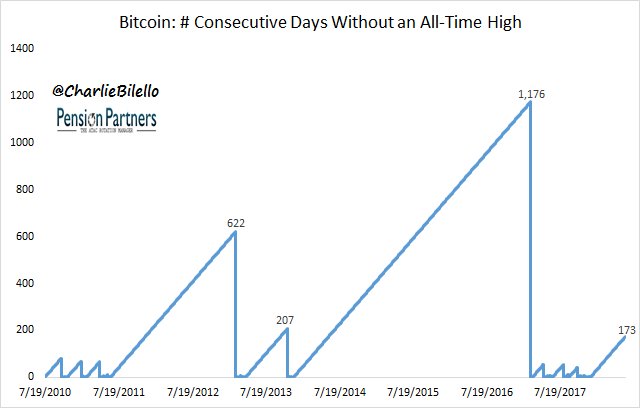 Bitcoin has now gone 173 days without a new highvoiloo (54)in #bitcoin • 8 years ago credit picture: twitter.com/charliebilello #cryptocurrency