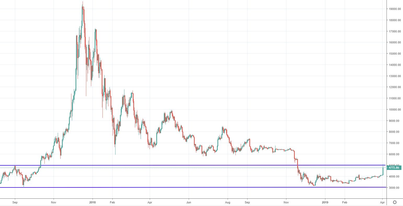 Good to see a nice spike up on the Bitcoin chart but it hit the blue resistance line, just over $5k and has fallen back. I'll be more bullish if it can break through that line and use it as support. Until then, its hard to get too excited. I did wish I had bought more at the lows when I saw what happened today but its still too early to see if I'll get another chance.