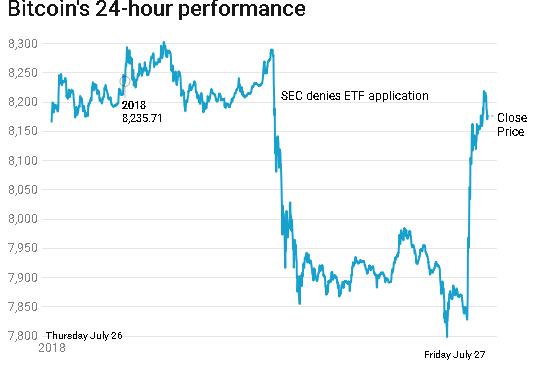 According to CoinDesk, Bitcoin fell to a low of $7,798.70 on Friday morning, down 6% from Thursday's news. A few hours later, as of 3:52 pm, it recovered to $8,211.87. ET. Earlier this week, cryptocurrencies have risen to a two-month high, in part because of rumors about exchange-traded fund approvals.