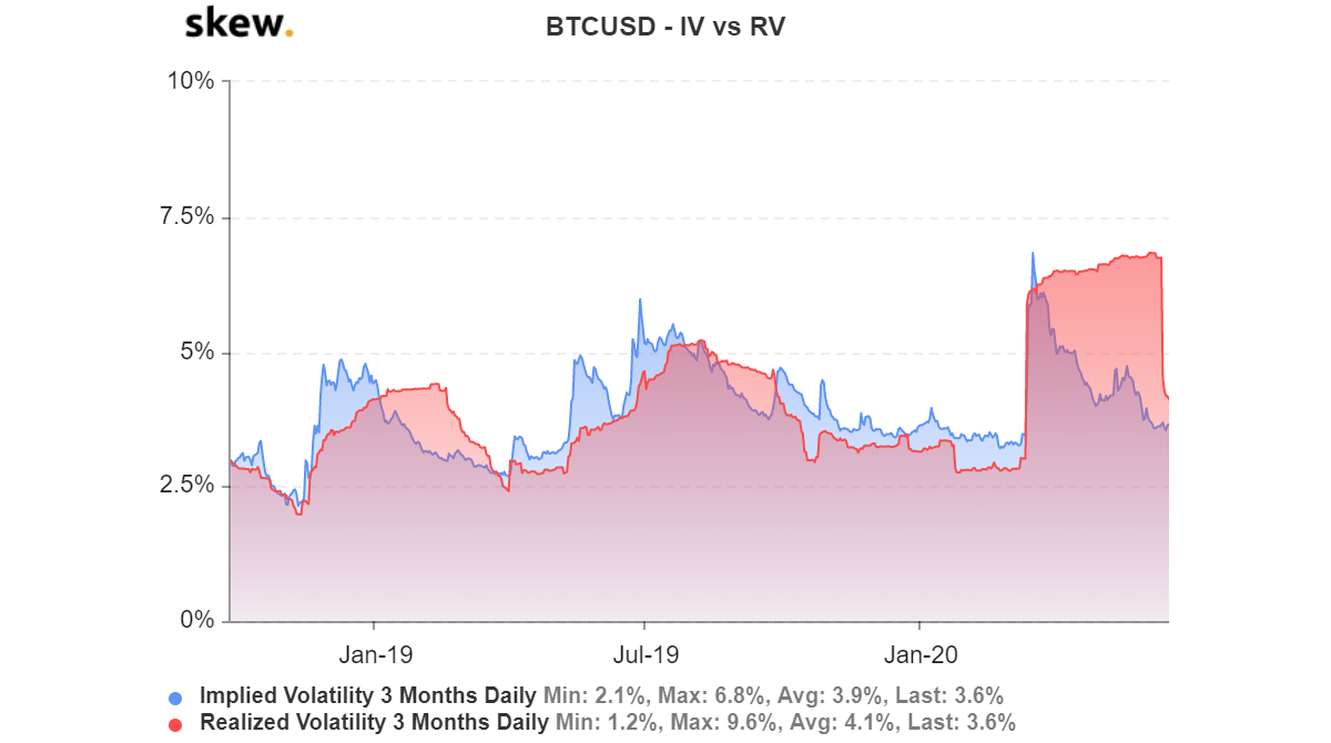 Ideally, the implied volatility is higher than the realized volatility to compensate the seller for the risks involved. However, in this case, the realized volatility had shot up with the implied volatility due to the huge sell-offs in the month of March. Soon after, the implied volatility started to trend lower since traders did not expect the price of the digital asset to swing any higher in the near future. On the other hand, the realized volatility more or less plateaued.