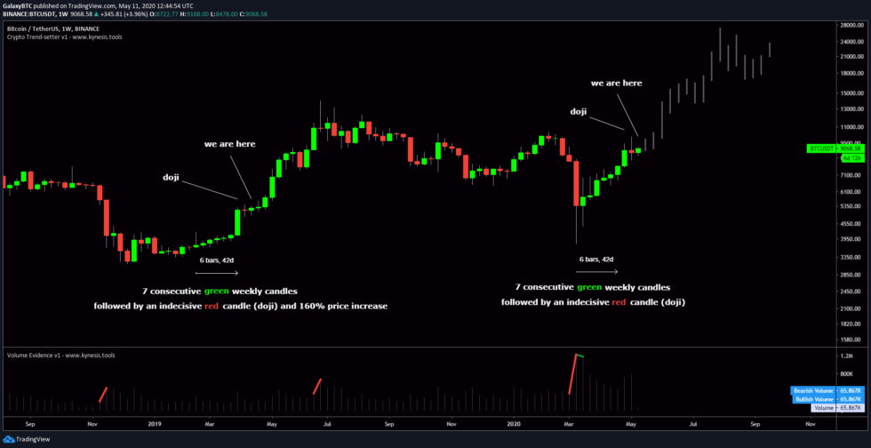 “Look what happened the last time we had 7 consecutive green weekly candles. We had a “doji” candle, followed by a 160% increase. By the looks of it, we’re in for a ride.”