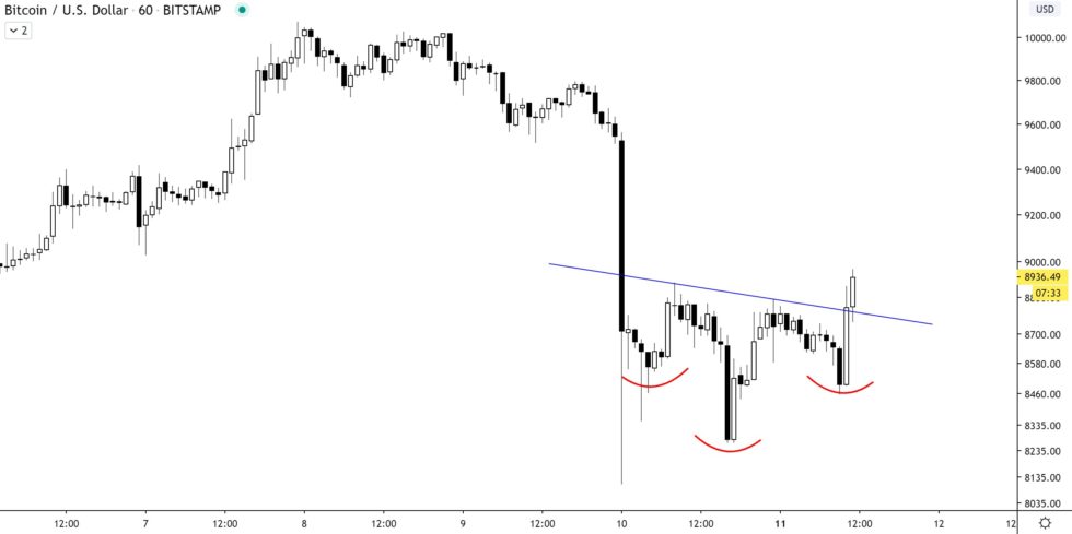 It does mark a roughly 10% rebound from lows of just over $8,000, although the selling pressure at $9,000 has slowed its momentum and has even put it at risk of seeing further downside.