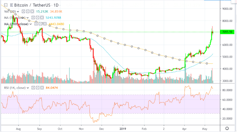 Bitcoin went full throttle last week, nuking major resistance at $6400 and marching ahead. The asset made 2019 high of $7521(exchanges price may vary depending on premium/discount) and remained strong throughout the week. The move looked more like a short squeeze since short positions have been piling up since mid-April. Adding to the fear last month was Bitfinex-Tether controversy that further convinced the traders about short term weakness of Bitcoin. However, Binance hack proved out to be a blessing in disguise with the Bitconists not giving undue importance to the hack, ever since the exchange stated that funds are insured.