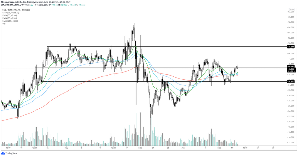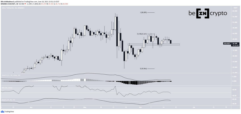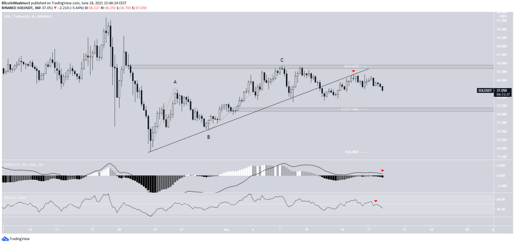 SOL has been increasing since bouncing on May 19. The upward movement continued until a high of $44.2 was reached on June 7. The high coincided with the 0.618 Fib retracement resistance level (black).