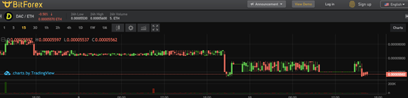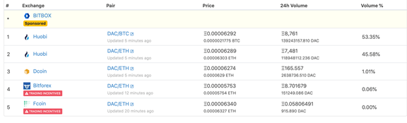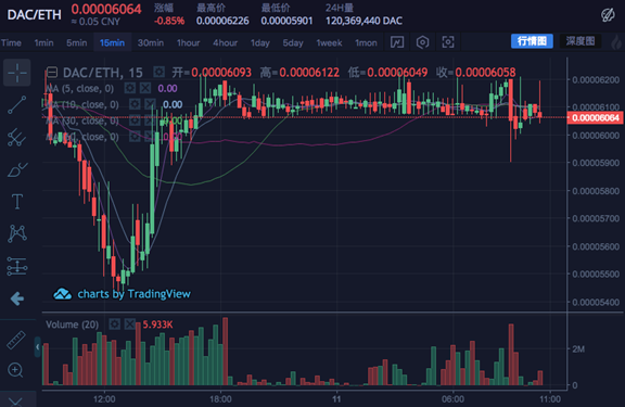 Let's look at a set of diagrams. Take DAC/ETH as an example. The currency is currently on four exchanges, including Fcoin, Huobi, Dcoin and Bitforex.