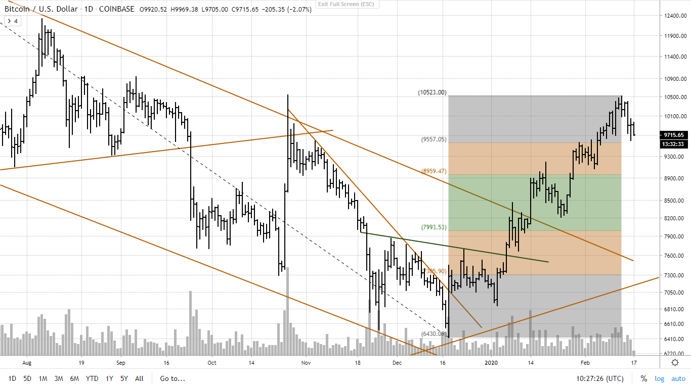 In addition, the OBV on the weekly is near support. Should we correct more, then this support will be broken downwards, usually suggesting a more serious move. Which will be in line, even with a 61.8% correction towards $8000.