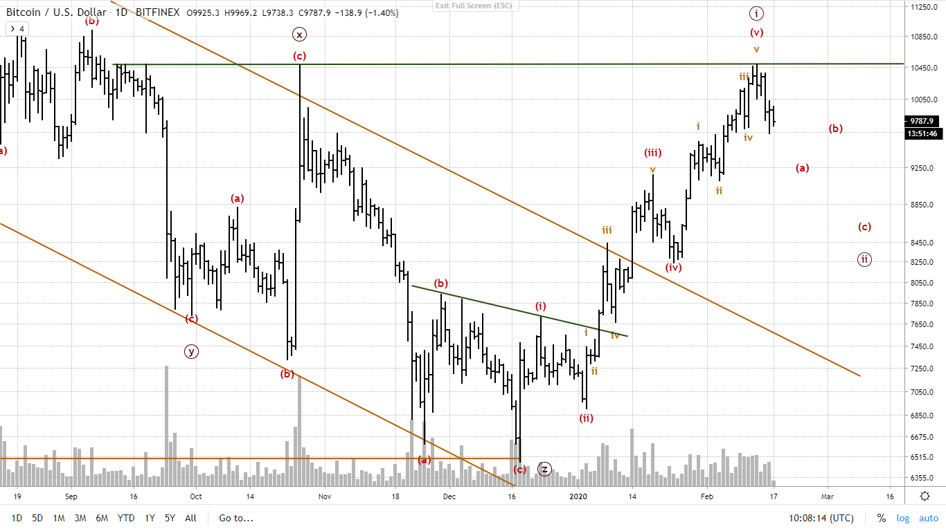 It's impossible to predict how this wave 2 correction will unfold. There is of course the Elliott wave guideline that the previous wave iv is a target level: around $8250; and that would be just fine for me. We are currently finding some support around a lower level wave iv, at $9700. But that would be a very shallow correction. More realistic is a target somewhere between $8k and $9k.