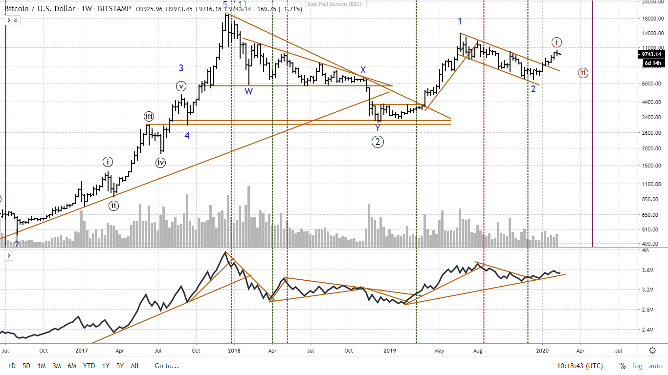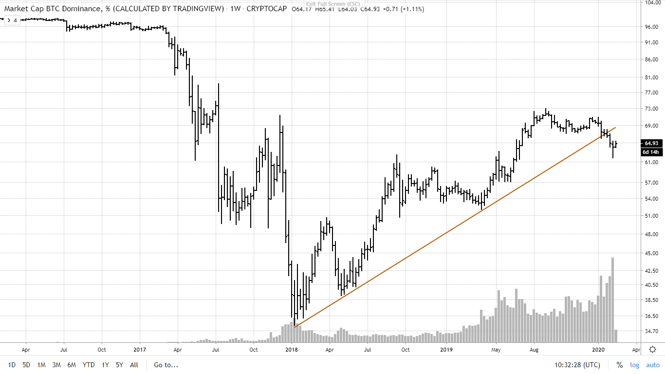 Maybe quite interesting is that the bitcoin dominance chart seems to give a sell signal, suggesting that another altcoin season is upon us. Until 2017 bitcoin dominance was over 95%. Only to drop to 35% in January 2018. Let's see if we get another altcoin bubble, this time, no doubt, with different 'must have' altcoins.