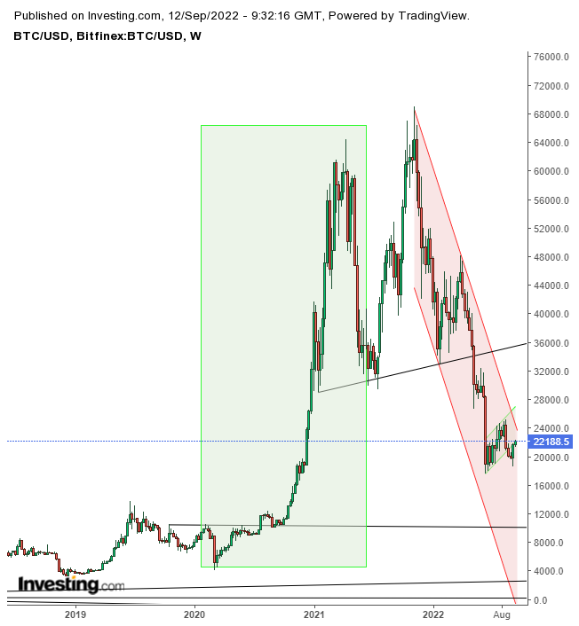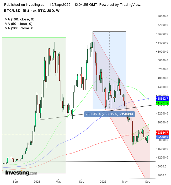 The price also finds resistance below the uptrend channel, yielding to the more important bearish channel. For reference, the price fell below the 200-week moving average (WMA) for the second time since March 2020. This is the first recorded since September 11, 2017.