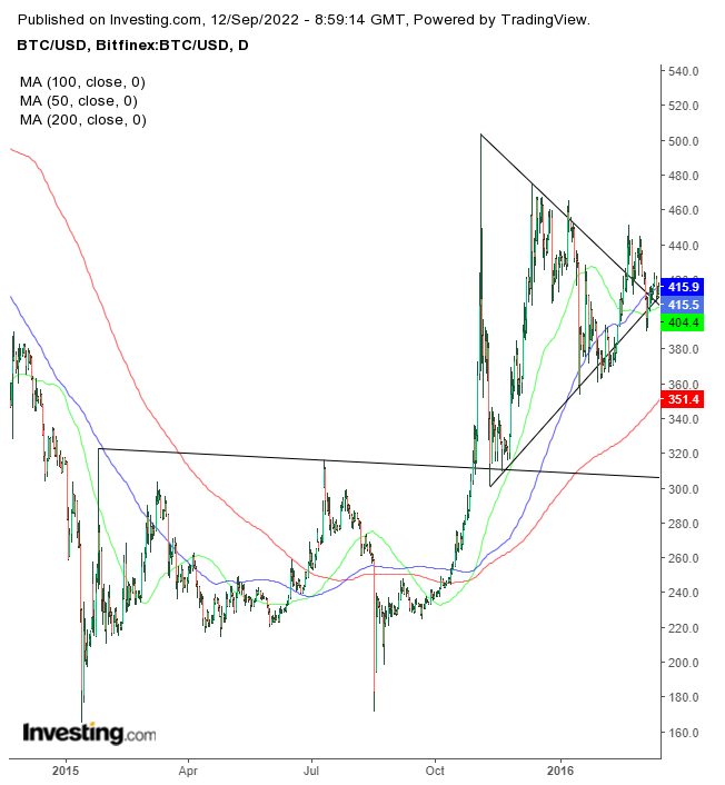 In 2016, Bitcoin's bottom set the stage for a large symmetrical triangle, followed by a steady upward trend.