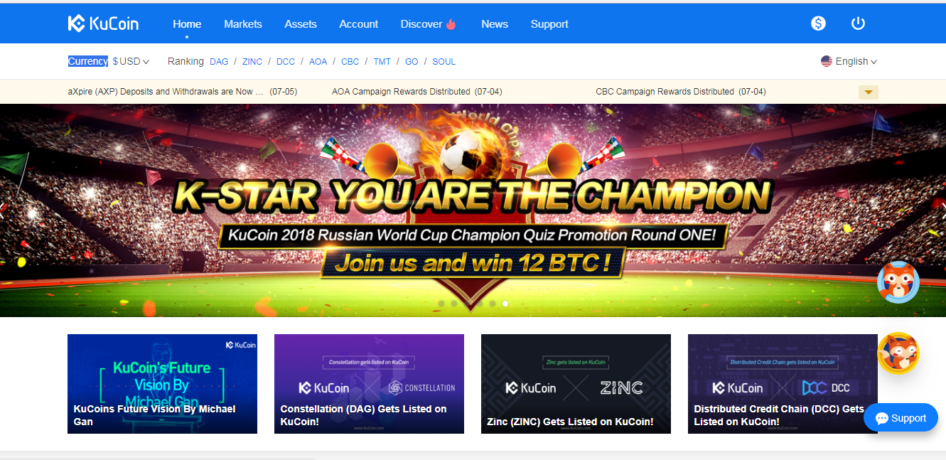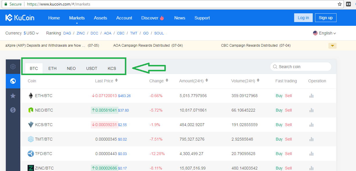 Kucoin Supports 5 trading pair such as BTC, ETH, NEO, USDT, and KCS.