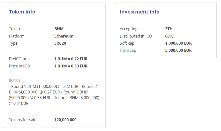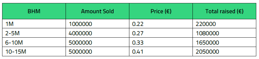 – Round 1 BHM (1,000,000) @ 0.22 EUR – Round 2 BHM (4,000,000) @ 0.27 EUR – Round 3 BHM (5,000,000) @ 0.33 EUR – Round 4 BHM (5,000,000) @ 0.41EUR