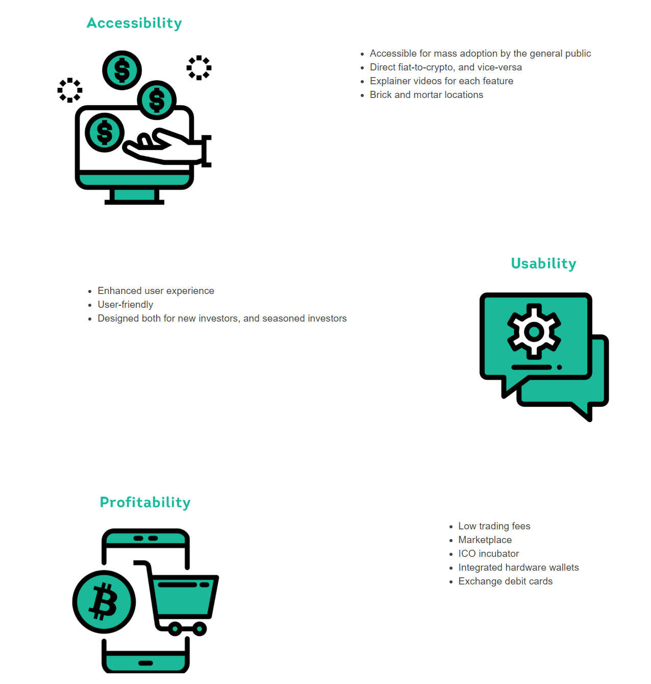 Once the foundation of their exchange is built, they want to progress and develop their business by adding additional streams. One of their visions is to create a crypto-marketplace linked to their exchange where vendors can trade products directly for cryptocurrency through a seamless and secure means.