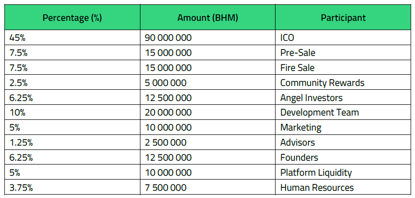 Bithemoth Coin (BHM) will be the token coin that they will issue. There will be a maximum amount of 200 000 000 (two hundred million) coins that will be created. They do not intend to increase it further. BHM is modelled and will run using the Ethereum blockchain with ERC 20. This will ensure the safety and security of the token in the long-term.